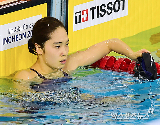 [엑스포츠뉴스=인천, 김한준 기자] 23일 오후 인천광역시 남구 문학박태환수영장에서 열린 '제17회 인천아시아경기대회(17th Asian Games Incheon 2014)' 여자배영 50m 결선 경기, 박한별이 기록을 확인한 후 아쉬운 표정을 보이고 있다.