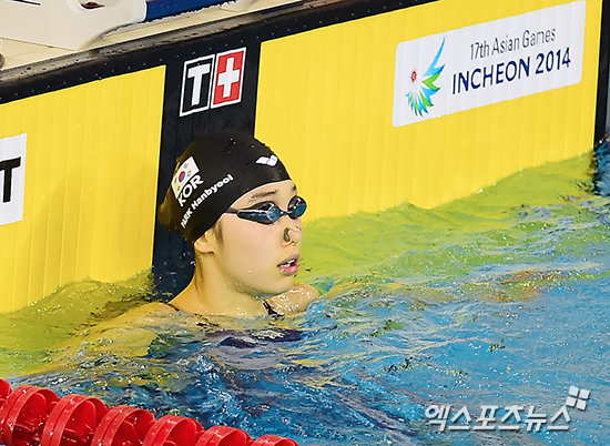 [엑스포츠뉴스=인천, 김한준 기자] 23일 오후 인천광역시 남구 문학박태환수영장에서 열린 '제17회 인천아시아경기대회(17th Asian Games Incheon 2014)' 여자배영 50m 결선 경기, 박한별이 기록을 확인한 후 아쉬운 표정을 보이고 있다.