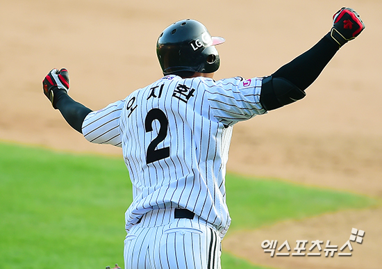 9회말 무사 2루 LG 오지환이 끝내기 안타를 날린 후 환호하고 있다.
