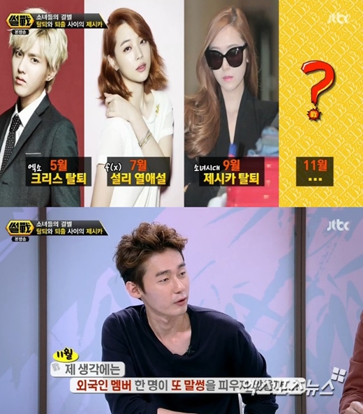 또 허지웅은 5월에 크리스 탈퇴, 7월 설리 열애설, 9월 제시카 탈퇴를 차례로 언급했다. 특히 허지웅은 "11월에 뭐가 터진다는 건데, 제 생각에 '외국인멤버 한 명이 말썽을 부리지 않을까' 생각도 든다"라고 예측했다
