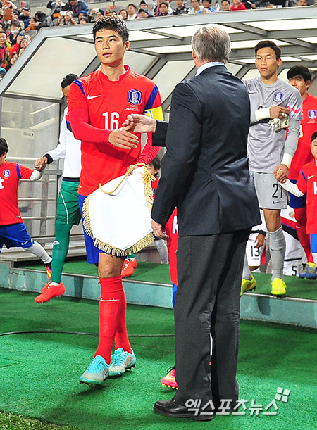 대한민국 기성용이 입장하면서 울리 슈틸리케 감독과 하이파이브를 하고 있다.