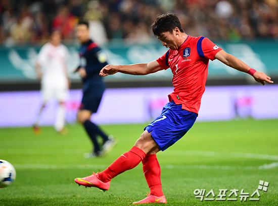 [엑스포츠뉴스=김한준 기자] 14일 오후 서울 상암동 서울월드컵경기장에서 열린 '하나은행 초정 축구 국가대표 친선경기' 대한민국과 코스타리카의 경기, 전반 대한민국 김민우가 슈팅을 시도하고 있다.