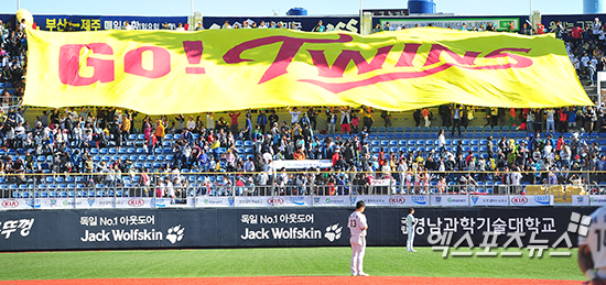 [엑스포츠뉴스=창원, 김한준 기자] 19일 오후 경남 창원 마산종합운동장에서 열린 '2014 한국 야쿠르트 세븐 프로야구' 준플레이오프 LG 트윈스와 NC 다이노스의 경기, 경기 전 국민의례때 LG 팬들이 외야에서 대형 현수막을 흔들고 있다.