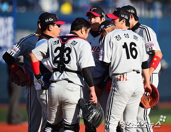 [엑스포츠뉴스=창원, 김한준 기자] 19일 오후 경남 창원 마산종합운동장에서 열린 '2014 한국 야쿠르트 세븐 프로야구' 준플레이오프 LG 트윈스와 NC 다이노스의 경기, 5회말 무사 1,2루 LG 양상문 감독이 마운드에 올라 선수들에게 작전을 지시하고 있다.