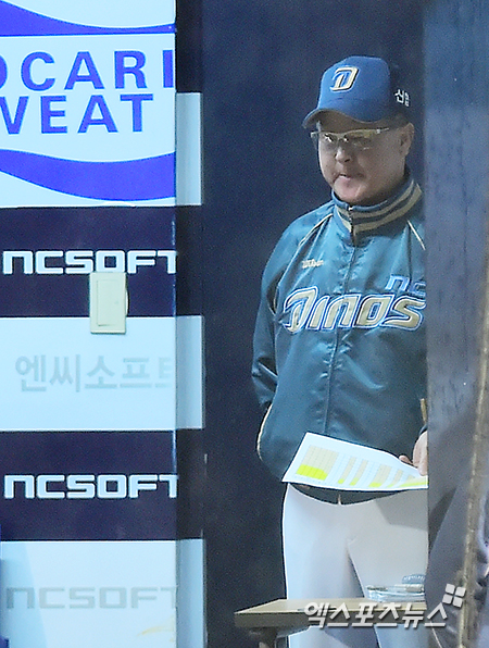 [엑스포츠뉴스=창원, 김한준 기자] 20일 오후 경남 창원 마산종합운동장에서 열린 '2014 한국 야쿠르트 세븐 프로야구' 준플레이오프 2차전 LG 트윈스와 NC 다이노스의 경기, 우천으로 경기가 취소되자 NC 김경문 감독이 더그아웃에서 그라운드를 바라보고 있다.