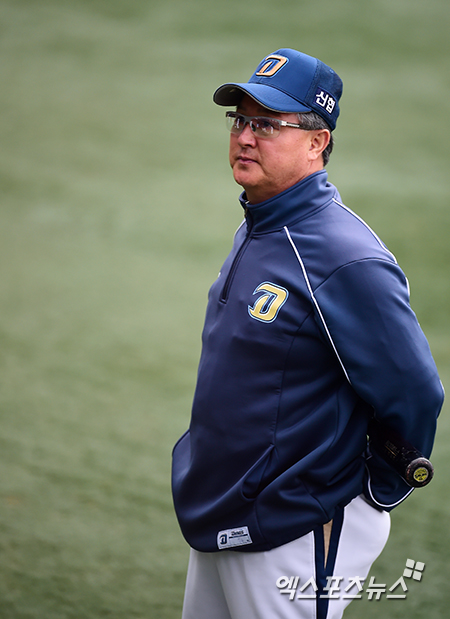 [엑스포츠뉴스=창원, 김한준 기자] 22일 오후 경남 창원 마산종합운동장에서 열린 '2014 한국 야쿠르트 세븐 프로야구' 준플레이오프 2차전 LG 트윈스와 NC 다이노스의 경기, 경기전 NC 김경문 감독이 하늘을 바라보고 있다.