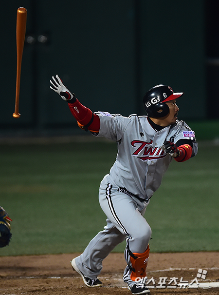 [엑스포츠뉴스=김한준 기자] 27일 오후 서울 목동야구장에서 열린  '2014 한국 야쿠르트 세븐 프로야구' 플레이오프 1차전 LG 트윈스와 넥센 히어로즈의 경기, 3회초 무사 만루 LG 이병규가 1타점 적시타를 날리고 있다.