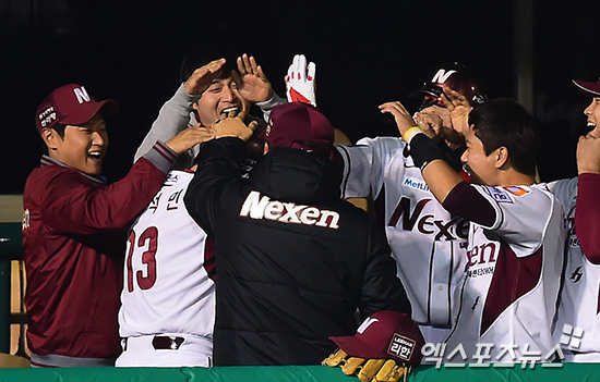 [엑스포츠뉴스=김한준 기자] 27일 오후 서울 목동야구장에서 열린  '2014 한국 야쿠르트 세븐 프로야구' 플레이오프 1차전 LG 트윈스와 넥센 히어로즈의 경기, 6회말 1사 2,3루 넥센 윤석민이 역전 스리런 홈런을 날린 후 더그아웃에서 축하를 받고 있다.