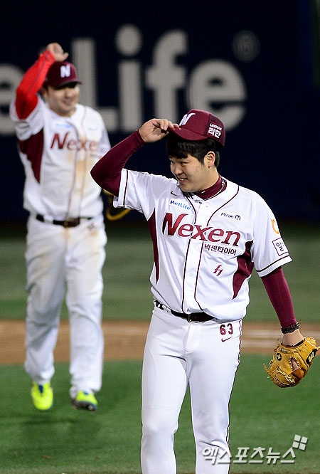 [엑스포츠뉴스=권태완 기자] 27일 오후 서울 목동야구장에서 열린 '2014 한국 야쿠르트 세븐 프로야구' 플레이오프 1차전 LG 트윈스와 넥센 히어로즈의 경기에 넥센이 6:3으로 승리했다. 마지막 아웃카운트가 올라가자 한현희가 기뻐하고 있다.