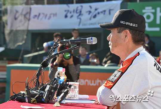 [엑스포츠뉴스=대전, 권혁재 기자] 28일 오후 대전광역시 광역시 중구 한밭야구장에서 열린 '한화 이글스 신임 김성근 감독 취임식'에서 김성근 감독이 취재진들과 인터뷰를 하고 있다.