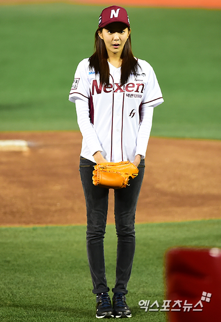 [엑스포츠뉴스=김한준 기자] 28일 오후 서울 목동야구장에서 열린  '2014 한국 야쿠르트 세븐 프로야구' 플레이오프 2차전 LG 트윈스와 넥센 히어로즈의 경기, 경기전 애프터스쿨 유이가 시구에 임하고 있다.