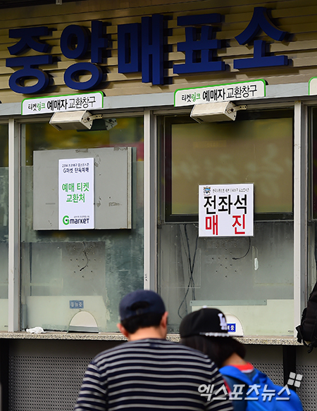 [엑스포츠뉴스=김한준 기자] 30일 오후 서울 송파구 잠실야구장에서 열린 '2014 한국 야쿠르트 세븐 프로야구' 플레이오프 3차전 넥센 히어로즈와 LG 트윈스의 경기, 경기전 전좌석 매진을 알리는 문구가 매표소에 붙여져 있다.
