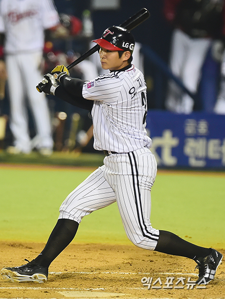 [엑스포츠뉴스=김한준 기자] 30일 오후 서울 송파구 잠실야구장에서 열린 '2014 한국 야쿠르트 세븐 프로야구' 플레이오프 3차전 넥센 히어로즈와 LG 트윈스의 경기, 2회말 2사 1루 LG 오지환이 좌익수 쪽 안타를 날리고 있다.