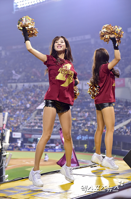 [엑스포츠뉴스=권혁재 기자] 30일 오후 서울 송파구 잠실야구장에서 열린 '2014 한국야쿠르트 세븐 프로야구' 플레이오프 3차전 넥센 히어로즈와 LG 트윈스의 경기, 넥센 치어리더 김한나가 열띤 응원전을 펼치고 있다.