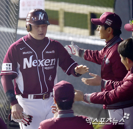 [엑스포츠뉴스=김한준 기자] 30일 오후 서울 송파구 잠실야구장에서 열린  '2014 한국 야쿠르트 세븐 프로야구' 플레이오프 3차전 넥센 히어로즈와 LG 트윈스의 경기, 5회초 무사 2,3루 넥센 이성열이 박동원의 2타점 2루타때 득점에 성공한 후 염경엽 감독과 하이파이브를 하고 있다.