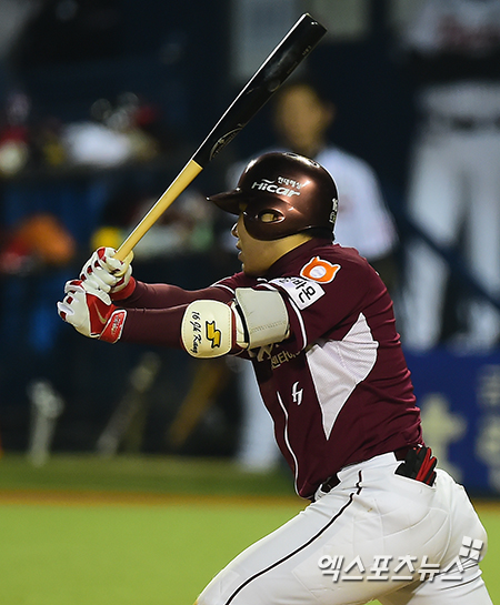 [엑스포츠뉴스=김한준 기자] 30일 오후 서울 송파구 잠실야구장에서 열린 '2014 한국 야쿠르트 세븐 프로야구' 플레이오프 3차전 넥센 히어로즈와 LG 트윈스의 경기, 8회초 2사 넥센 강정호가 우익수쪽 안타를 날리고 있다.