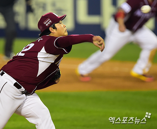 [엑스포츠뉴스=김한준 기자] 30일 오후 서울 송파구 잠실야구장에서 열린 '2014 한국 야쿠르트 세븐 프로야구' 플레이오프 3차전 넥센 히어로즈와 LG 트윈스의 경기, 8회말 무사 1,2루 넥센 조상우가 공을 힘차게 던지고 있다.