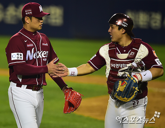 [엑스포츠뉴스=김한준 기자] 30일 오후 서울 송파구 잠실야구장에서 열린 '2014 한국 야쿠르트 세븐 프로야구' 플레이오프 3차전 넥센 히어로즈와 LG 트윈스의 경기, 8회말 수비를 마친 넥센 손승락과 박동원이 하이파이브를 하고 있다.
