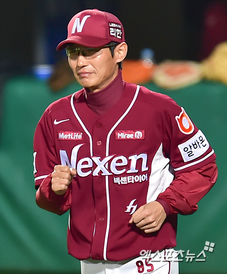 [엑스포츠뉴스=대구, 권혁재 기자] 4일 오후 대구광역시 북구 대구시민야구장에서 열린 '2014 한국야쿠르트 세븐 프로야구' 넥센 히어로즈와 삼성 라이온즈의 한국시리즈 1차전 경기, 경기전 라인업 소개에 넥센 염경엽 감독이 그라운드로 달려나오고 있다.