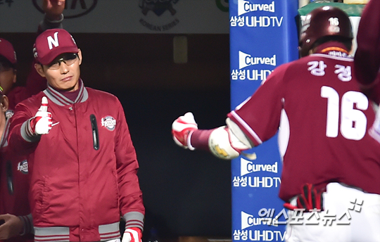 [엑스포츠뉴스=대구, 권혁재 기자] 4일 오후 대구광역시 북구 대구시민야구장에서 열린 '2014 한국야쿠르트 세븐 프로야구' 넥센 히어로즈와 삼성 라이온즈의 한국시리즈 1차전 경기, 2-2 동점인 8회초 무사 1루 삼성 차우찬을 상대로 좌중월 역전 투런포를 날린 넥센 강정호를 향해 염경엽 감독이 엄지손가락을 치겨들어 보이고 있다.