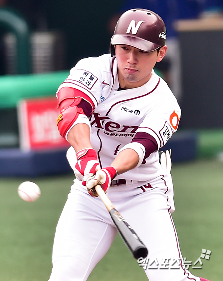 [엑스포츠뉴스=권혁재 기자] 8일 오후 서울 양천구 목동야구장에서 열린 '2014 한국야쿠르트 세븐 프로야구' 삼성 라이온즈와 넥센 히어로즈의 한국시리즈 4차전 경기, 1회말 선두타자 서건창이 좌전안타를 날리고 있다.