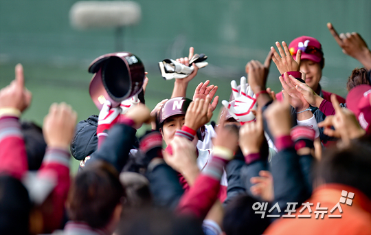 [엑스포츠뉴스=권혁재 기자] 8일 오후 서울 양천구 목동야구장에서 열린 '2014 한국야쿠르트 세븐 프로야구' 삼성 라이온즈와 넥센 히어로즈의 한국시리즈 4차전 경기, 넥센이 2-0으로 앞선 2회말 2아웃 2, 3루 넥센 선수들이 좌월 스리러포를 날린 유한준을 축하해 주고 있다.