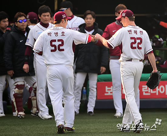박병호-밴헤켄 '오늘은 승리하자'[포토]