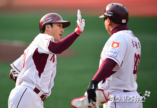 [엑스포츠뉴스=김한준 기자] 8일 오후 서울 목동야구장에서 열린 '2014 한국야쿠르트 세븐 프로야구' 삼성 라이온즈와 넥센 히어로즈의 한국시리즈 4차전 경기, 4회말 2사 1루 넥센 이택근이 투런 홈런을 날린 후 하이파이브를 하고 있다.
