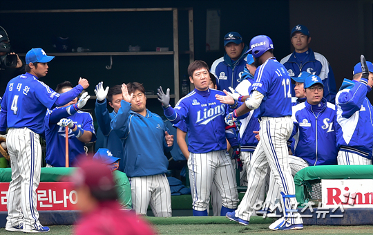 [엑스포츠뉴스=권혁재 기자] 8일 오후 서울 양천구 목동야구장에서 열린 '2014 한국야쿠르트 세븐 프로야구' 삼성 라이온즈와 넥센 히어로즈의 한국시리즈 4차전 경기, 삼성이 0-7로 뒤진 7회초 삼성 선두타자 나바로가 중월 솔로포를 날리고 들어와 동료들과 하이파이브 하고 있다.