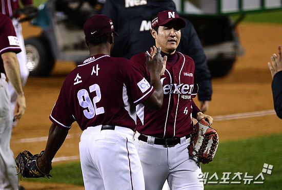 [엑스포츠뉴스=권태완 기자] 10일 오후 서울 송파구 잠실야구장에서 열린 '2014 한국야쿠르트 세븐 프로야구 한국시리즈 5차전' 넥센 히어로즈와 삼성 라이온즈의 경기에 5회말 2사 주자 1루 0:0에서 채태인의 우중간 타구를 유한준이 플라이아웃으로 처리해 이닝을 마치자 헨리 소사가 유한준에게 감사인사를 하고 있다.