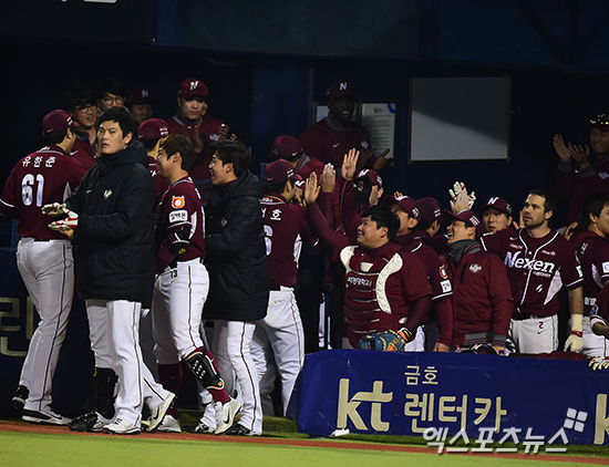 [엑스포츠뉴스=김한준 기자] 10일 오후 송파구 잠실야구장에서 열린 '2014 한국야쿠르트 세븐 프로야구' 넥센 히어로즈와 삼성 라이온즈의 한국시리즈 5차전 경기, 8회말 2사 만루 위기를 넘긴 넥센 선수들이 더그아웃에서 하이파이브를 하고 있다.