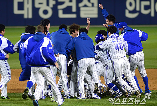 [엑스포츠뉴스=권태완 기자] 10일 오후 서울 송파구 잠실야구장에서 열린 '2014 한국야쿠르트 세븐 프로야구 한국시리즈 5차전' 넥센 히어로즈와 삼성 라이온즈의 경기에 9회말 2사 주자 1-3루 0:1에서 삼성 최형우가 끝내기 역전 2루타로 2:1 역전승을 거두고 동료들과 기뻐하고 있다.