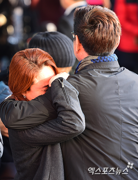 이날 발인식에 참석한 이경실이 눈물을 흘리고 있다.