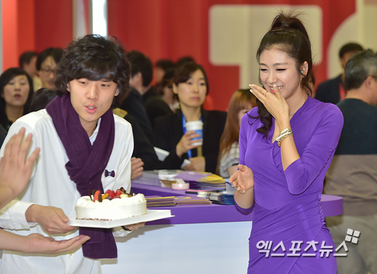 [엑스포츠뉴스=벡스코(부산), 권혁재 기자] 21일 부산 벡스코에서 '게임은 끝나지 않았다(Game is not over)'라는 슬로건 아래 화려하게 막을 올린 지스타 2014(G-STAR 2014) 2일차, 토탈게임 마케팅 퍼블리셔 '퍼플 프랜즈' 부스의 치어리더 김연정이 갑작스레 받은 생일 케이크에 미소를 짓고 있다.