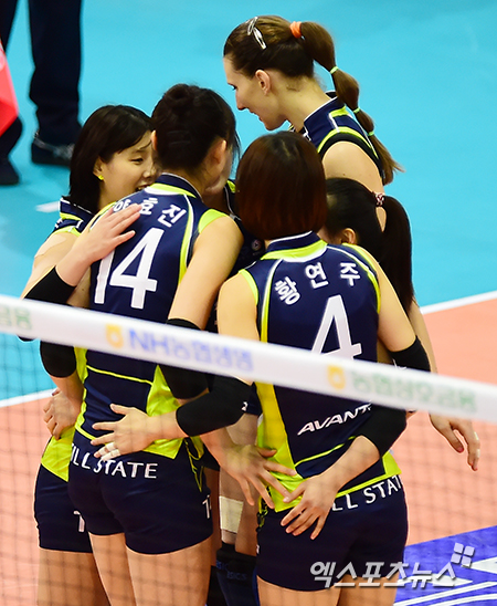 [엑스포츠뉴스=수원, 김한준 기자] 3일 오후 경기도 수원시 장안구 수원실내체육관에서 열린 'NH농협 2014-2015 V-리그' 현대건설 힐스테이트와 한국 도로공사의 여자부 경기, 1세트 현대건설 선수들이 득점에 성공한 후 기뻐하고 있다.