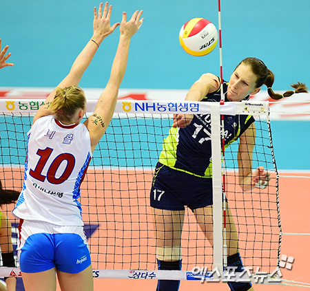 [엑스포츠뉴스=수원, 김한준 기자] 3일 오후 경기도 수원시 장안구 수원실내체육관에서 열린 'NH농협 2014-2015 V-리그' 현대건설 힐스테이트와 한국 도로공사의 여자부 경기, 1세트 현대건설 폴리가 공격을 시도하고 있다.