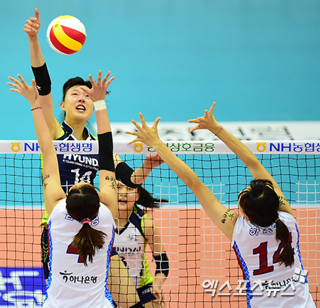 [엑스포츠뉴스=수원, 김한준 기자] 3일 오후 경기도 수원시 장안구 수원실내체육관에서 열린 'NH농협 2014-2015 V-리그' 현대건설 힐스테이트와 한국 도로공사의 여자부 경기, 1세트 현대건설 양효진이 공격을 시도하고 있다.