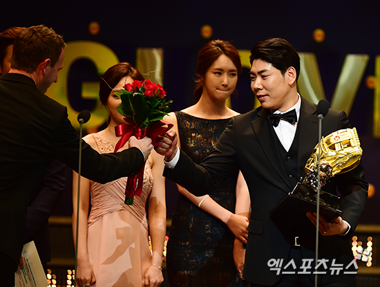 [엑스포츠뉴스=김한준 기자] 9일 오후 서울 삼성동 코엑스 오디토리움에서 열린 '2014 한국야쿠르트 세븐프로야구 골든글러브 시상식' 유격수 부문 수상자인 넥센 강정호가 팀동료 밴헤켄의 축하를 받고 있다.