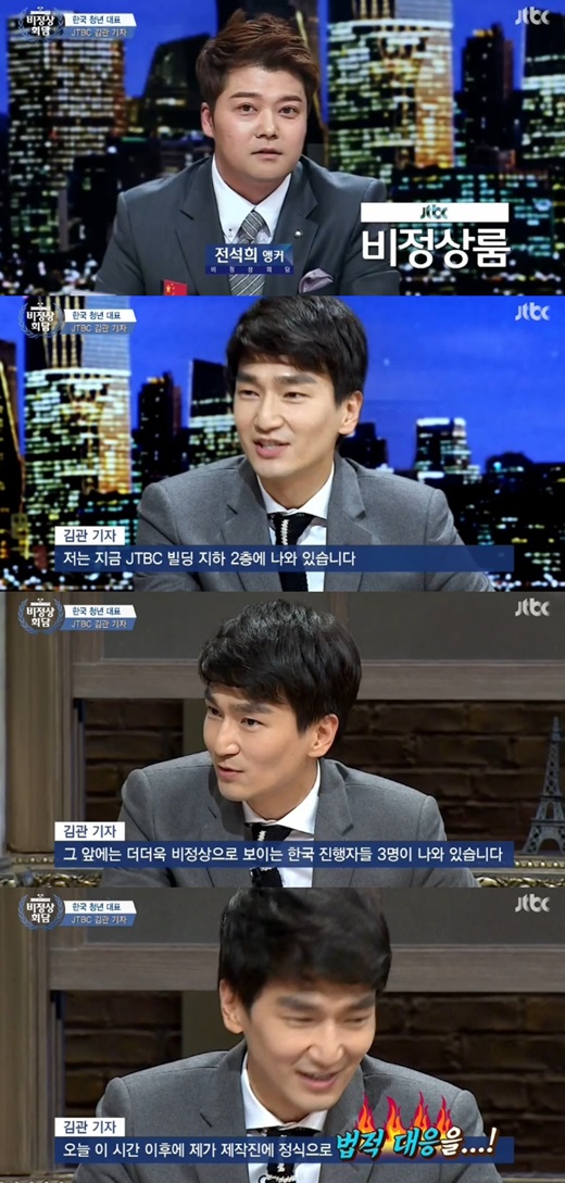 이에 김관은 "전 지금 JTBC 빌딩 지하 2층에 나와 있습니다. 각국에 있는 비정상들이 나와 정 자세로 앉아있고요. 그 앞에는 더더욱 비정상으로 보이는 한국 진행자들 3명이 나와 있다"며 진지하게 보도했다.