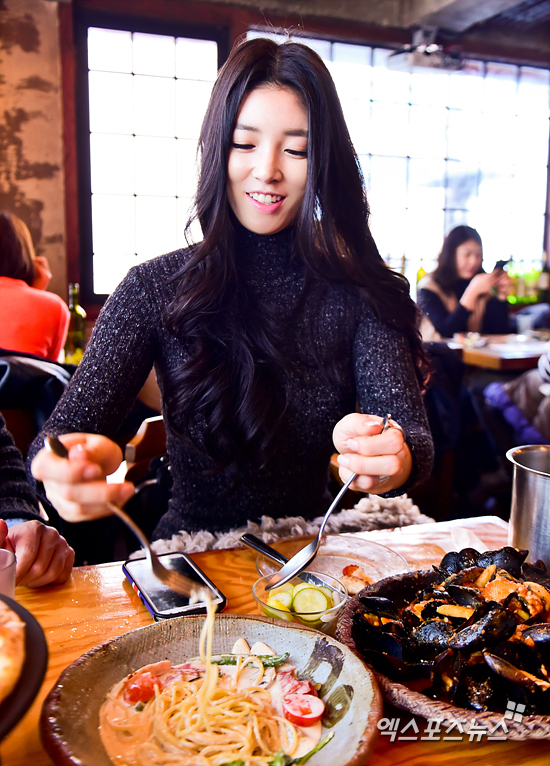 [엑스포츠뉴스=권혁재 기자] 20일 오전 서울 강남구 역삼동 한 카페이서 모델 유승옥이 엑스포츠뉴스와의 먹방 인터뷰에서 파스타를 담고 있다.
