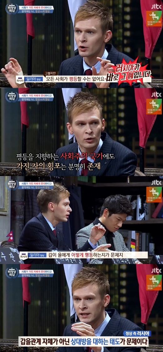 이어 일리야는 "그렇지만 모든 사회가 평등할 순 없다. 러시아가 바로 그 예다. 사회주의 국가에도 가진 자의 횡포는 분명히 존재한다"면서 "갑이 을에게 어떻게 행동하는지가 문제다"라며 갑을관계 자체가 아닌 상대방을 대하는 태도가 문제라며 핵심을 이야기 했다.