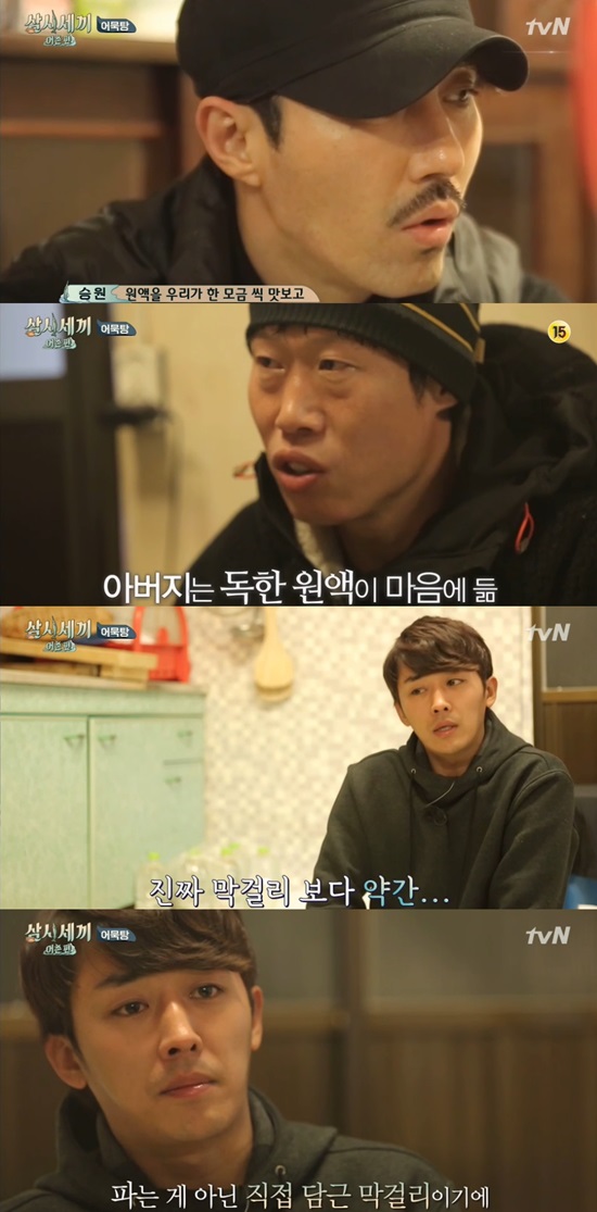 유해진은 막거리 원액을 맛본 뒤 "나는 그렇게 강한 거 같지 않다"고 말했다. 이에 차승원은 "이따 훅 올라온다"고 전했다.