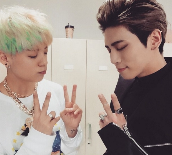 공개된 사진 속 엠버와 종현은 두 눈을 감은 채 브이자를 그리고 있다. 남매 같이 다정한 두사람의 모습이 훈훈함을 자아낸다.