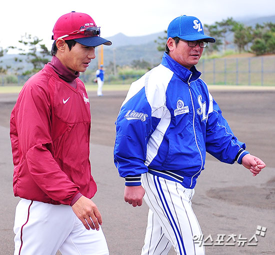 [엑스포츠뉴스=오키나와(일본), 김한준 기자] 24일 일본 오키나와 아카마 구장에서 열린 삼성 라이온즈와 넥센 히어로즈와의 연습경기, 경기 전 넥센 염경엽 감독과 삼성 류중일 감독이 대화를 나누고 있다.