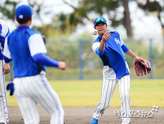 [엑스포츠뉴스=오키나와(일본), 김한준 기자] 24일 일본 오키나와 아카마 구장에서 열린 삼성 라이온즈와 넥센 히어로즈와의 연습경기, 경기 전 삼성 임창용이 베이스커버 훈련에서 토스를 하고 있다.