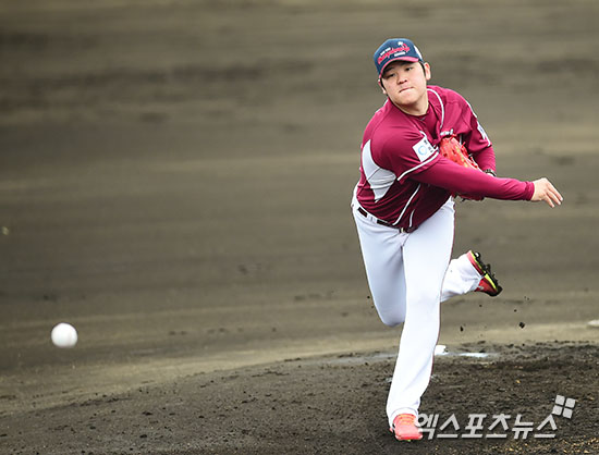 [엑스포츠뉴스=오키나와(일본), 김한준 기자] 26일 오전 일본 오키나와현 아카마 구장에서 삼성 라이온즈와 넥센 히어로즈와의 연습경기, 1회말 넥센 선발투수 한현희가 공을 힘차게 던지고 있다.
