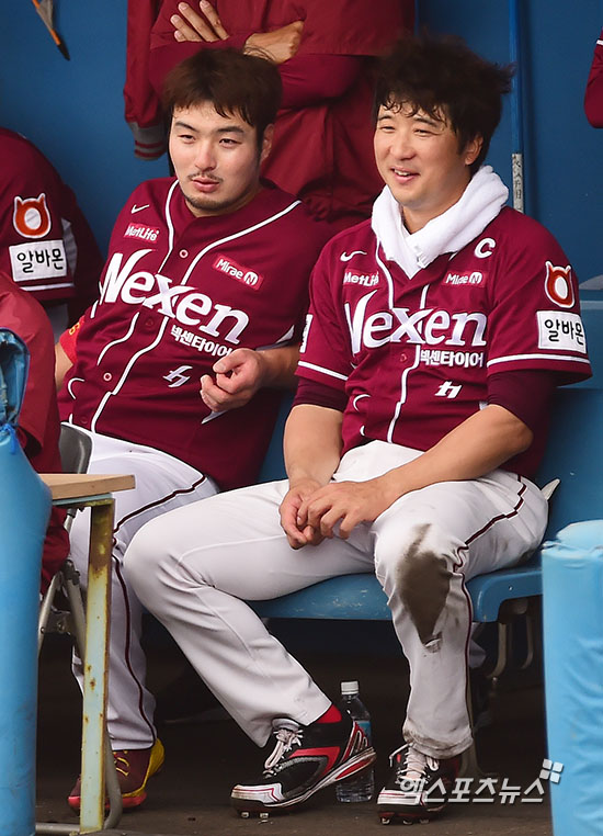 [엑스포츠뉴스=오키나와(일본), 김한준 기자] 26일 오전 일본 오키나와현 아카마 구장에서 삼성 라이온즈와 넥센 히어로즈와의 연습경기, 넥센 박병호와 이택근이 더그아웃에서 대화를 나누고 있다.