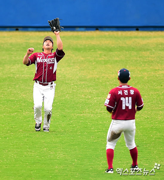[엑스포츠뉴스=오키나와(일본), 김한준 기자] 26일 오전 일본 오키나와현 아카마 구장에서 삼성 라이온즈와 넥센 히어로즈와의 연습경기, 2회말 2사 1루 넥센 이택근이 이승엽의 타구를 잡아내고 있다.