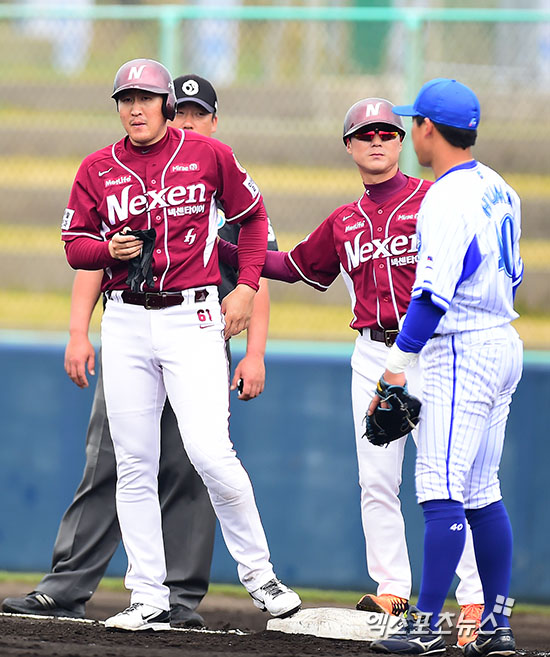 [엑스포츠뉴스=오키나와(일본), 김한준 기자] 28일 오후 일본 오키나와현 기노완 구장에서 열린 요코하마 DeNA 베이스타스와 넥센 히어로즈의 경기, 4회초 2사 넥센 유한준이 안타를 친 후 1루에 출루했다.