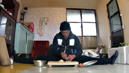 이 사진에서 추성훈은 다리를 찢은 채 도마 위에 있는 양파를 써는 데 집중하고 있다.